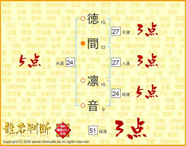 生活面を象徴する運勢です。外部から受ける影響力を表し、結婚運、家庭運や職場、環境への順応性を表します。総運から人運を引いた画数。姓や名が1文字の場合を除く。