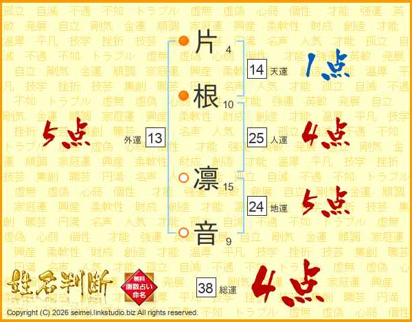 生活面を象徴する運勢です。外部から受ける影響力を表し、結婚運、家庭運や職場、環境への順応性を表します。総運から人運を引いた画数。姓や名が1文字の場合を除く。