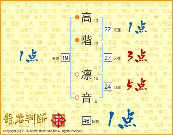 生活面を象徴する運勢です。外部から受ける影響力を表し、結婚運、家庭運や職場、環境への順応性を表します。総運から人運を引いた画数。姓や名が1文字の場合を除く。