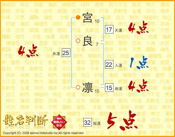 宮良凛さんの総運は32画の5点!