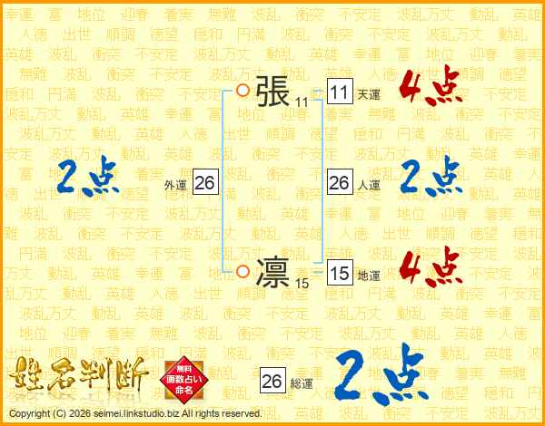 生活面を象徴する運勢です。外部から受ける影響力を表し、結婚運、家庭運や職場、環境への順応性を表します。総運から人運を引いた画数。姓や名が1文字の場合を除く。