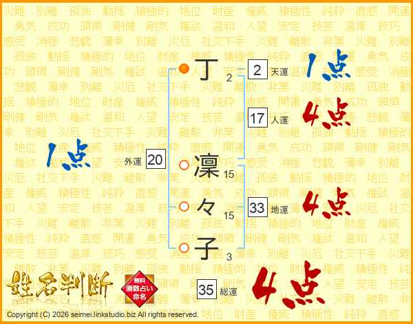 生活面を象徴する運勢です。外部から受ける影響力を表し、結婚運、家庭運や職場、環境への順応性を表します。総運から人運を引いた画数。姓や名が1文字の場合を除く。