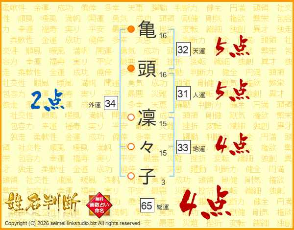 亀(16画)頭(16画) 凜(15画)々(15画)子(3画)