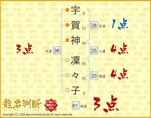 宇(6画)賀(12画)神(10画) 凜(15画)々(15画)子(3画)