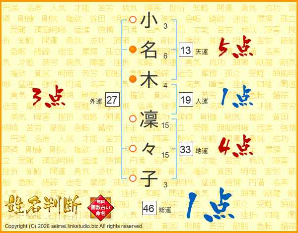 小(3画)名(6画)木(4画) 凜(15画)々(15画)子(3画)