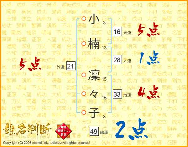 小(3画)楠(13画) 凜(15画)々(15画)子(3画)