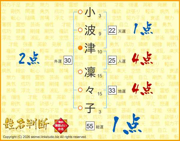 小(3画)波(9画)津(10画) 凜(15画)々(15画)子(3画)