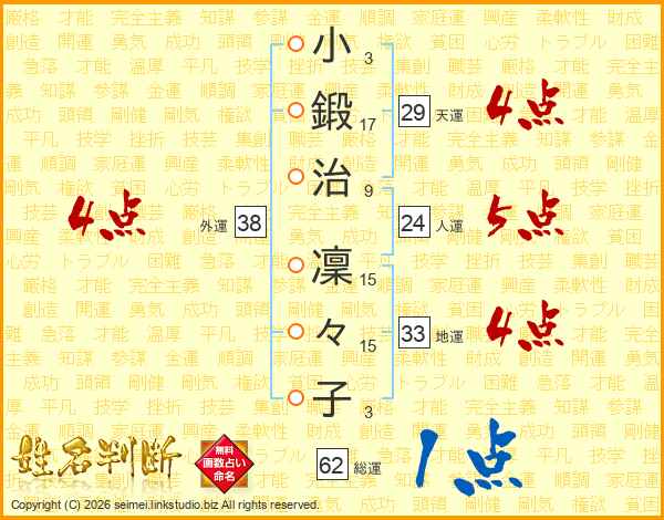 小(3画)鍛(17画)治(9画) 凜(15画)々(15画)子(3画)