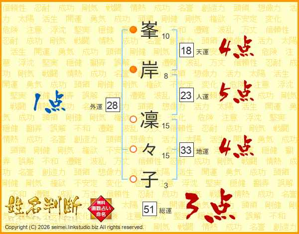 峯(10画)岸(8画) 凜(15画)々(15画)子(3画)