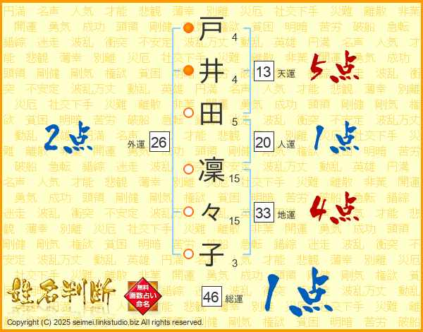 戸(4画)井(4画)田(5画) 凜(15画)々(15画)子(3画)