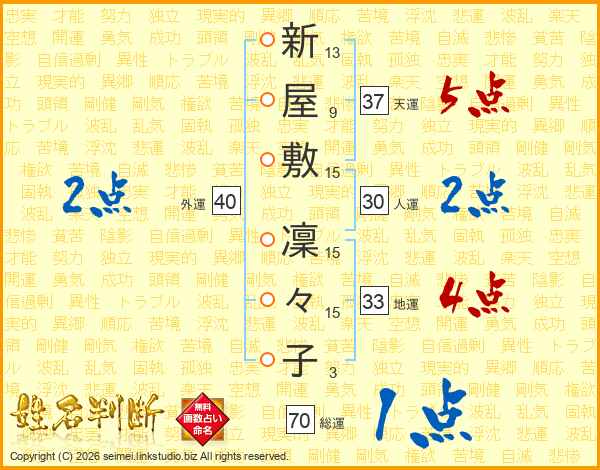 新(13画)屋(9画)敷(15画) 凜(15画)々(15画)子(3画)