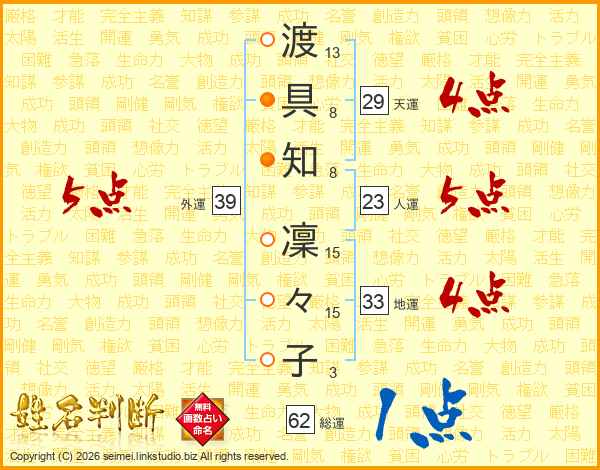 渡(13画)具(8画)知(8画) 凜(15画)々(15画)子(3画)