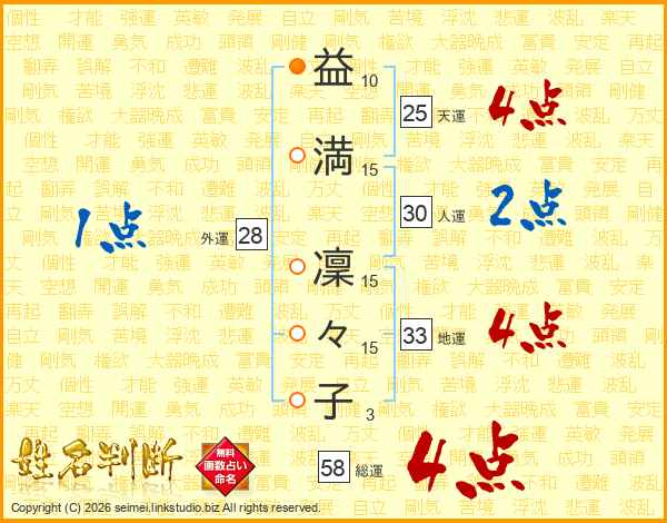 益(10画)満(15画) 凜(15画)々(15画)子(3画)