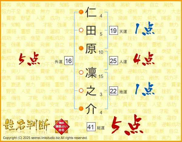 仁(4画)田(5画)原(10画) 凜(15画)之(3画)介(4画)