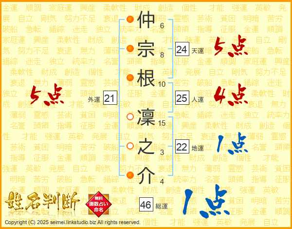 仲(6画)宗(8画)根(10画) 凜(15画)之(3画)介(4画)