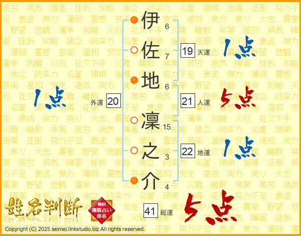 伊(6画)佐(7画)地(6画) 凜(15画)之(3画)介(4画)