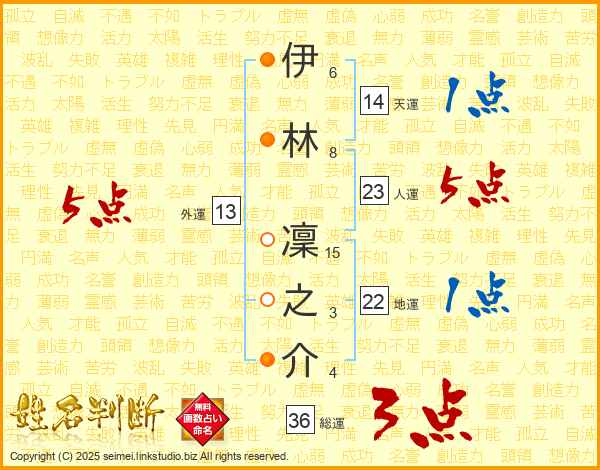 伊(6画)林(8画) 凜(15画)之(3画)介(4画)