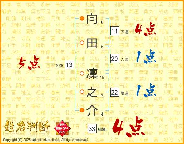 向(6画)田(5画) 凜(15画)之(3画)介(4画)