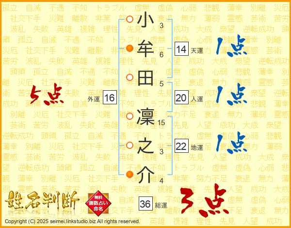 小(3画)牟(6画)田(5画) 凜(15画)之(3画)介(4画)