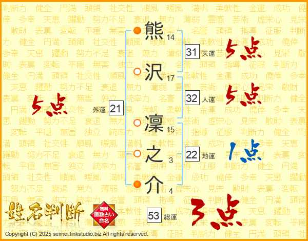 熊(14画)沢(17画) 凜(15画)之(3画)介(4画)