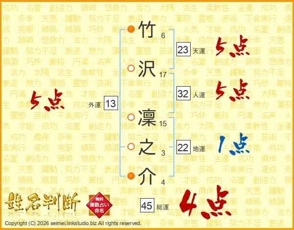 竹(6画)沢(17画) 凜(15画)之(3画)介(4画)