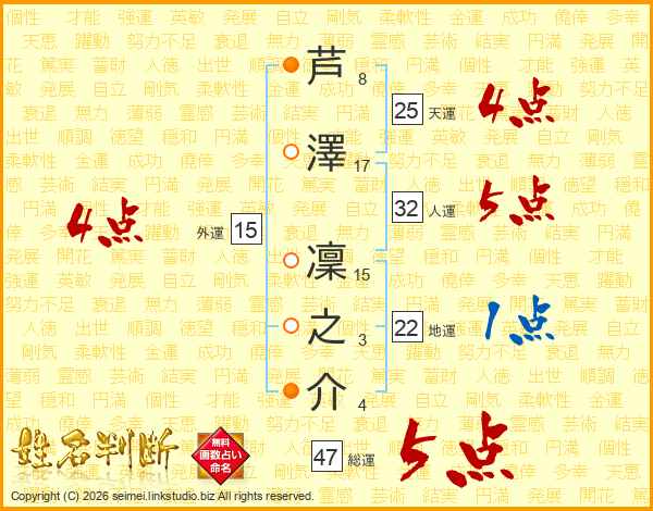 芦澤凜之介さんの総運は47画の5点!