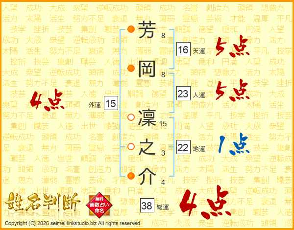 芳(8画)岡(8画) 凜(15画)之(3画)介(4画)