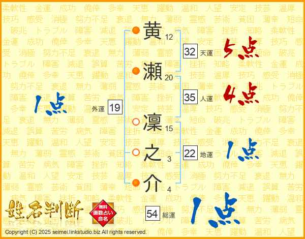 黄(12画)瀬(20画) 凜(15画)之(3画)介(4画)