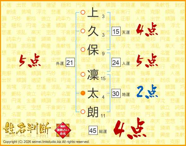 上(3画)久(3画)保(9画) 凜(15画)太(4画)朗(11画)