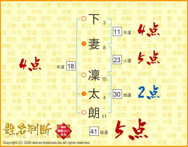 下(3画)妻(8画) 凜(15画)太(4画)朗(11画)