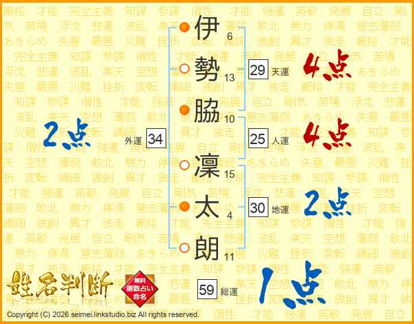 伊(6画)勢(13画)脇(10画) 凜(15画)太(4画)朗(11画)