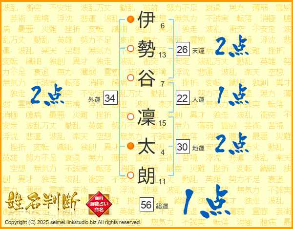 伊(6画)勢(13画)谷(7画) 凜(15画)太(4画)朗(11画)