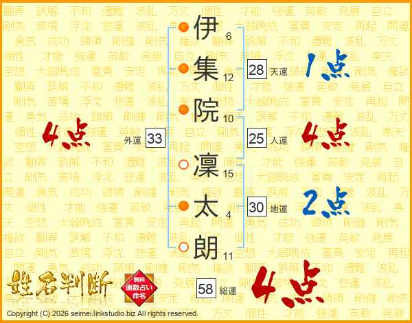 伊(6画)集(12画)院(10画) 凜(15画)太(4画)朗(11画)