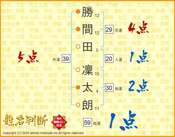勝(12画)間(12画)田(5画) 凜(15画)太(4画)朗(11画)