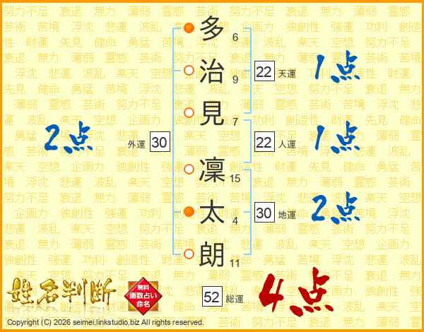多(6画)治(9画)見(7画) 凜(15画)太(4画)朗(11画)