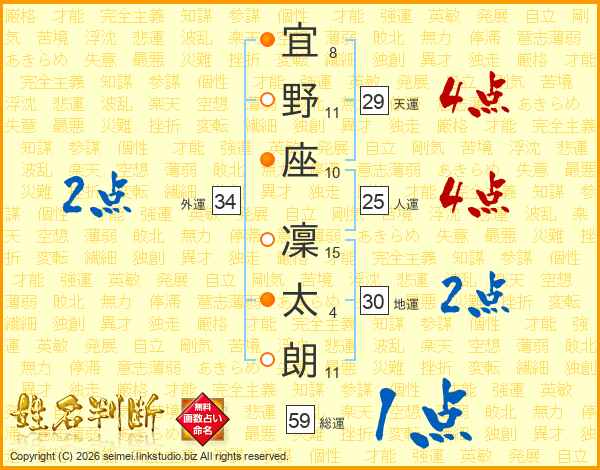 宜(8画)野(11画)座(10画) 凜(15画)太(4画)朗(11画)