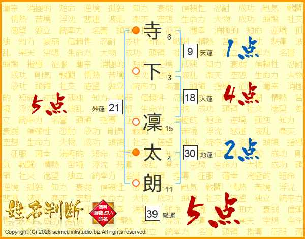 寺(6画)下(3画) 凜(15画)太(4画)朗(11画)