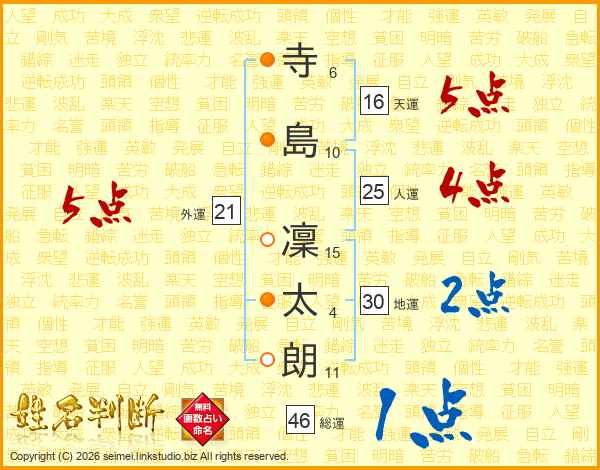 寺(6画)島(10画) 凜(15画)太(4画)朗(11画)