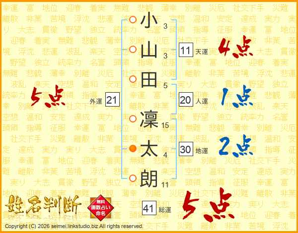 小(3画)山(3画)田(5画) 凜(15画)太(4画)朗(11画)