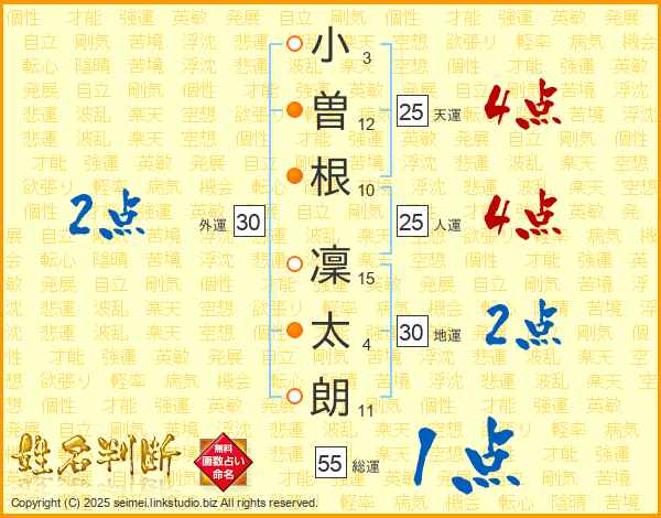 小(3画)曽(12画)根(10画) 凜(15画)太(4画)朗(11画)