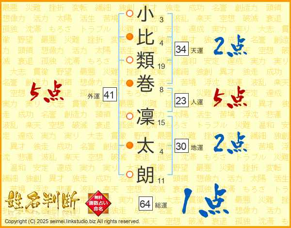 小(3画)比(4画)類(19画)巻(8画) 凜(15画)太(4画)朗(11画)