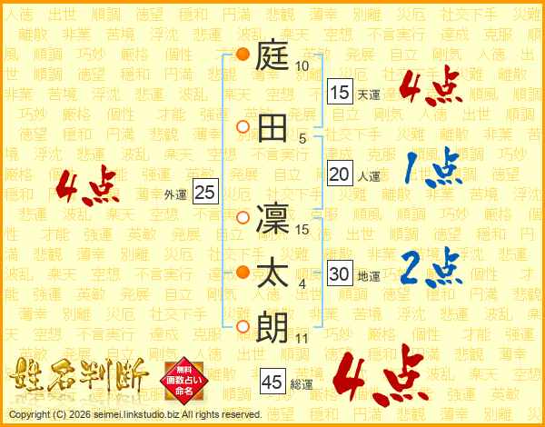 庭(10画)田(5画) 凜(15画)太(4画)朗(11画)