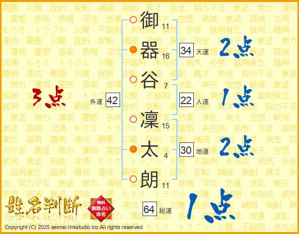 御(11画)器(16画)谷(7画) 凜(15画)太(4画)朗(11画)