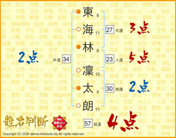 東(8画)海(11画)林(8画) 凜(15画)太(4画)朗(11画)