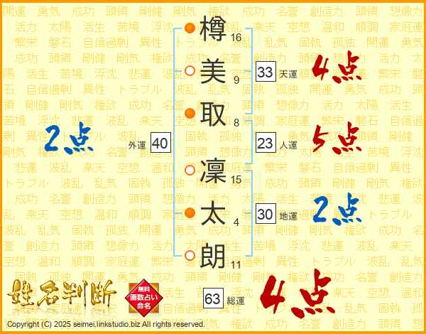 樽(16画)美(9画)取(8画) 凜(15画)太(4画)朗(11画)