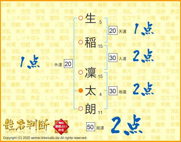 生(5画)稲(15画) 凜(15画)太(4画)朗(11画)
