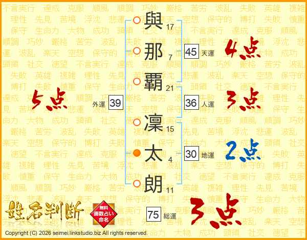 與(17画)那(7画)覇(21画) 凜(15画)太(4画)朗(11画)