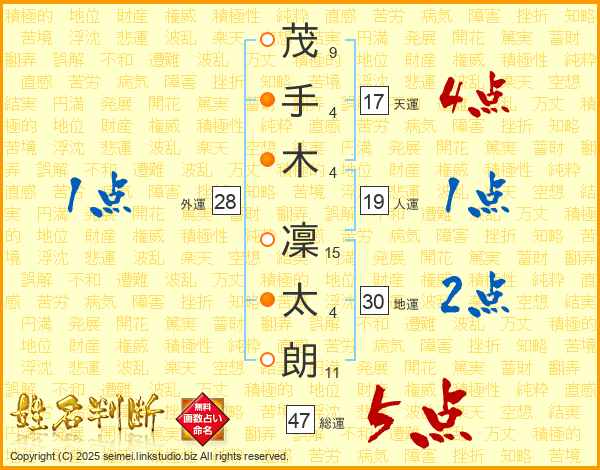 茂(9画)手(4画)木(4画) 凜(15画)太(4画)朗(11画)