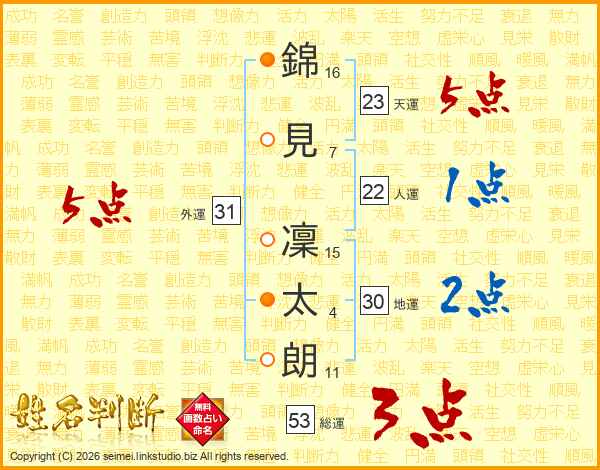 錦(16画)見(7画) 凜(15画)太(4画)朗(11画)