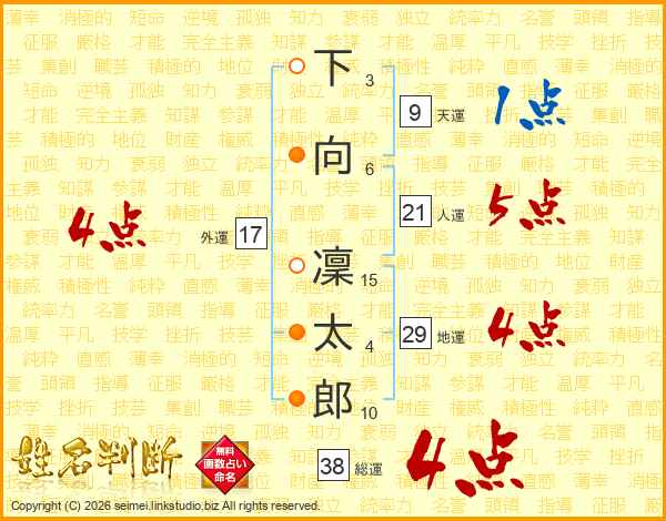 下(3画)向(6画) 凜(15画)太(4画)郎(10画)